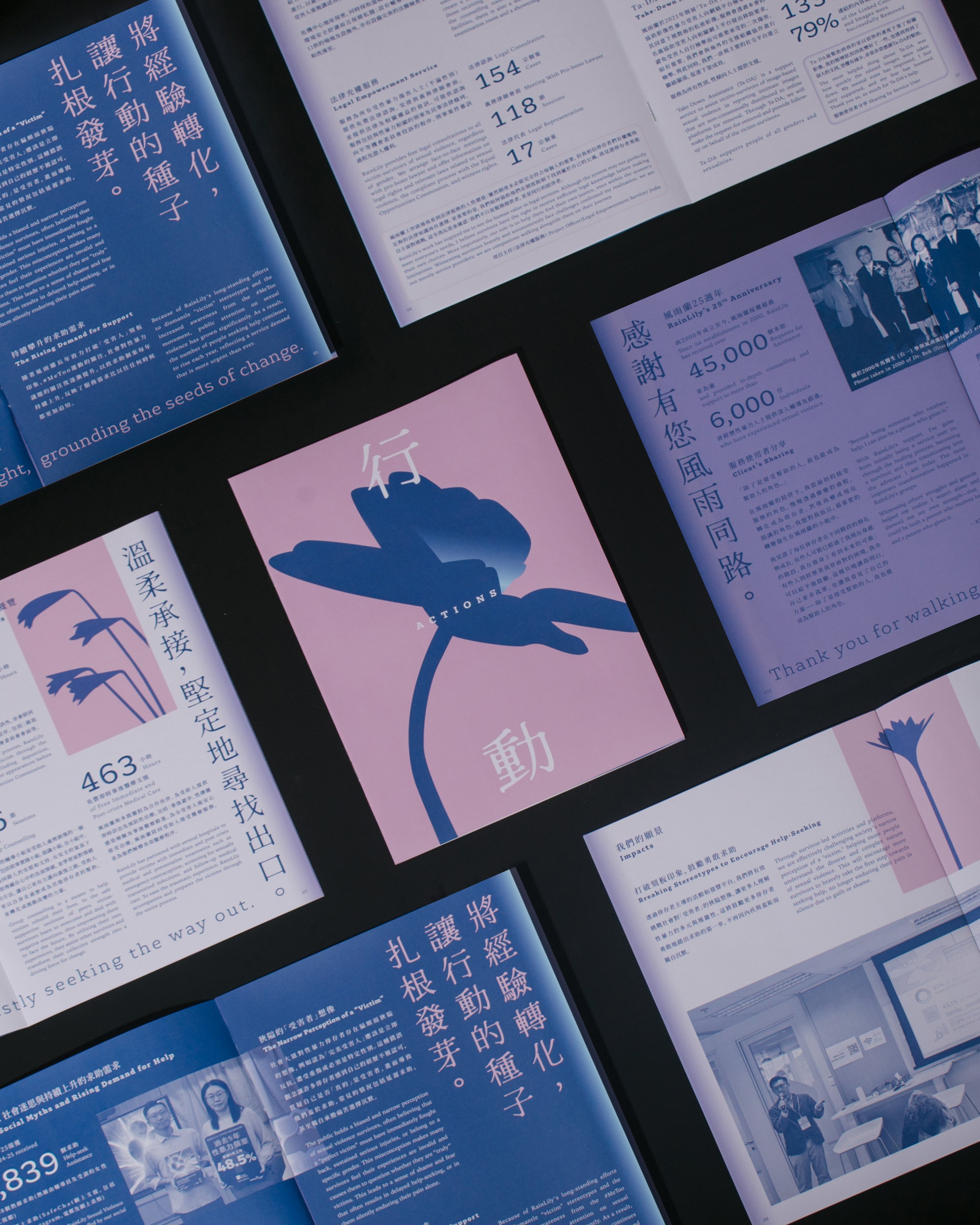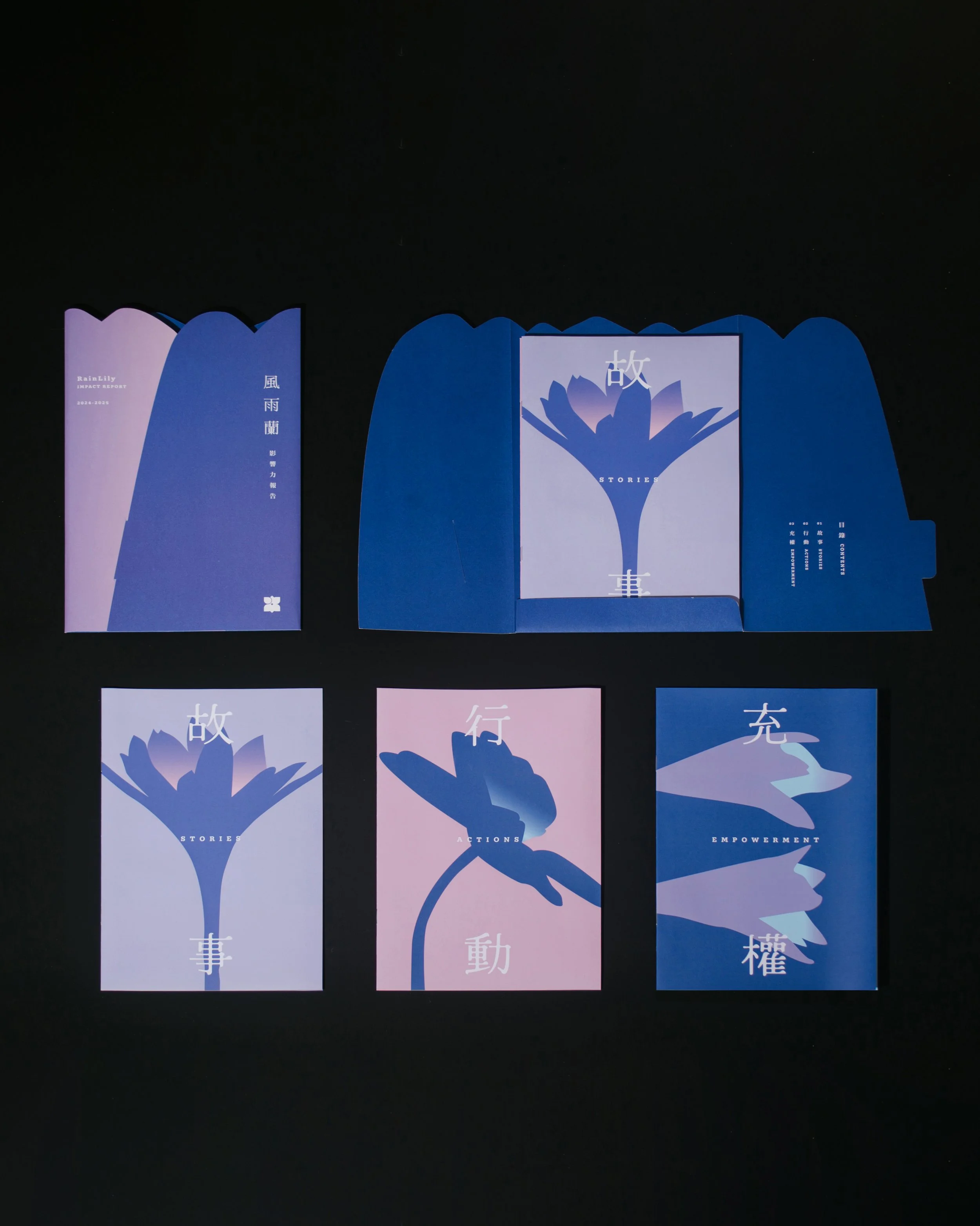 The RainLily Impact Report honours the same spirit of consent and agency that defines the organisation itself. Three distinct booklets are thoughtfully enveloped within a Rainlily-shaped folder, granting readers the freedom to choose their own reading order — a design choice that respects individual agency and refuses to impose a prescribed narrative rhythm.