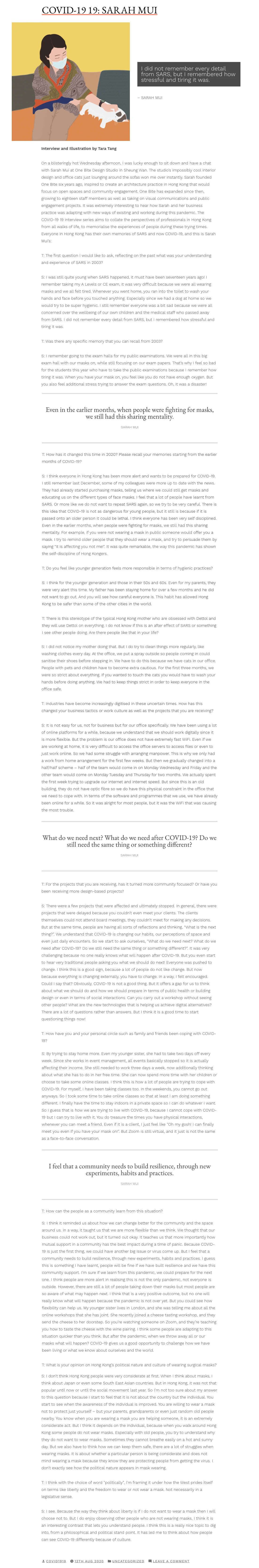How are you Hong Kong Blog | Aug 2020 Aug 12 Written By Gemma Chan COVID-19 19: SARAH MUIInterview and Illustration by Tara Tang Full interview here Gemma Chan