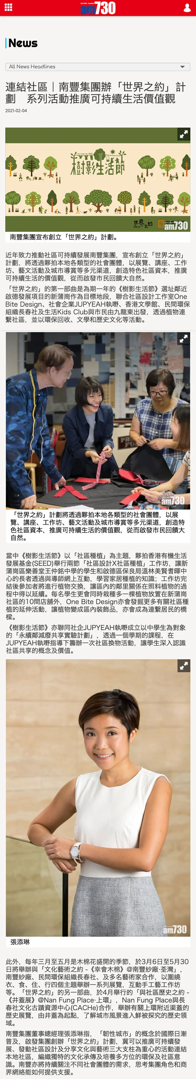am730 | Feb 2021 Feb 4 Written By Gemma Chan 連結社區|南豐集團辦「世界之約」計劃系列活動推廣可持續生活價值觀 Full article here Gemma Chan