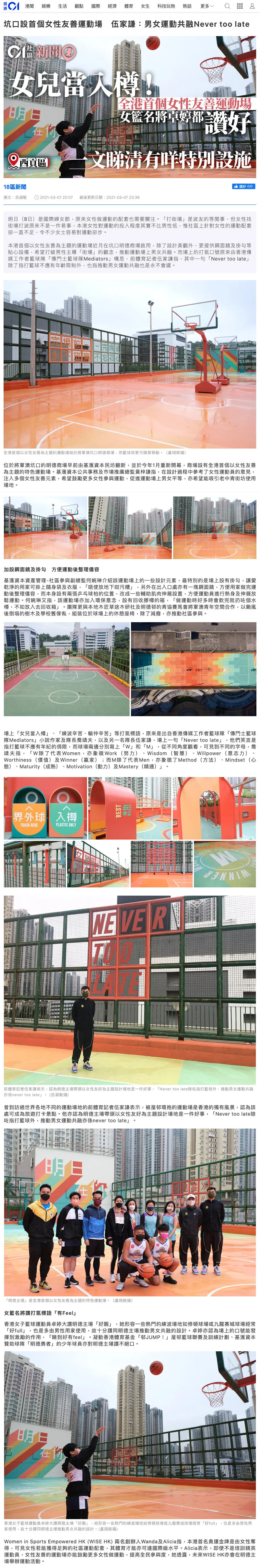 HK01 | Mar 2021 Mar 7 Written By Gemma Chan 坑口設首個女性友善運動場伍家謙:男女運動共融Never too late Full article here Gemma Chan