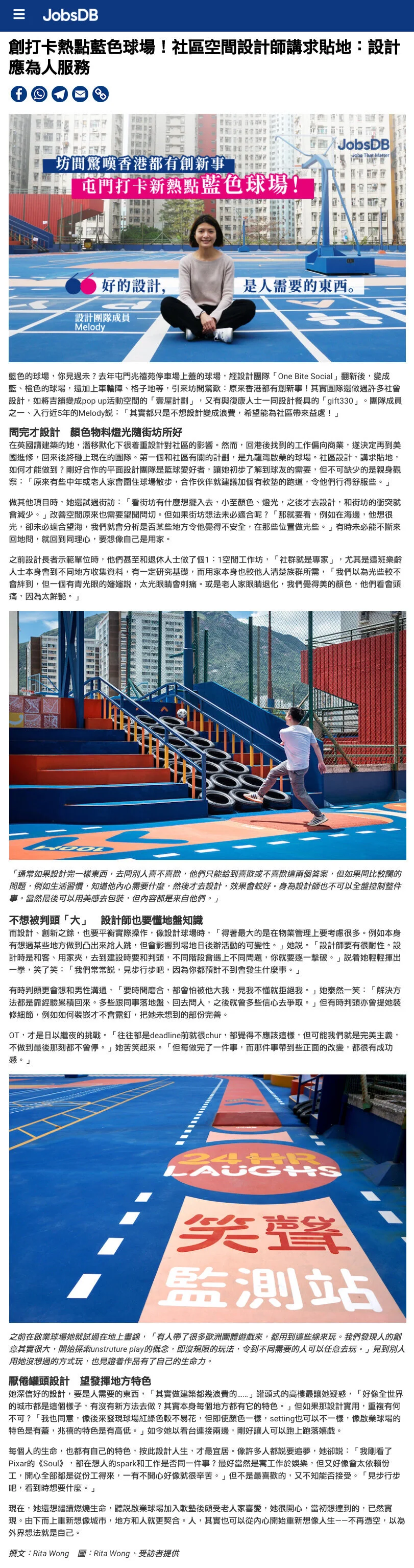 JobsDB | Mar 2021 Mar 15 Written By Gemma Chan 創打卡熱點藍色球場!社區空間設計師講求貼地:設計應為人服務 Full article here Gemma Chan