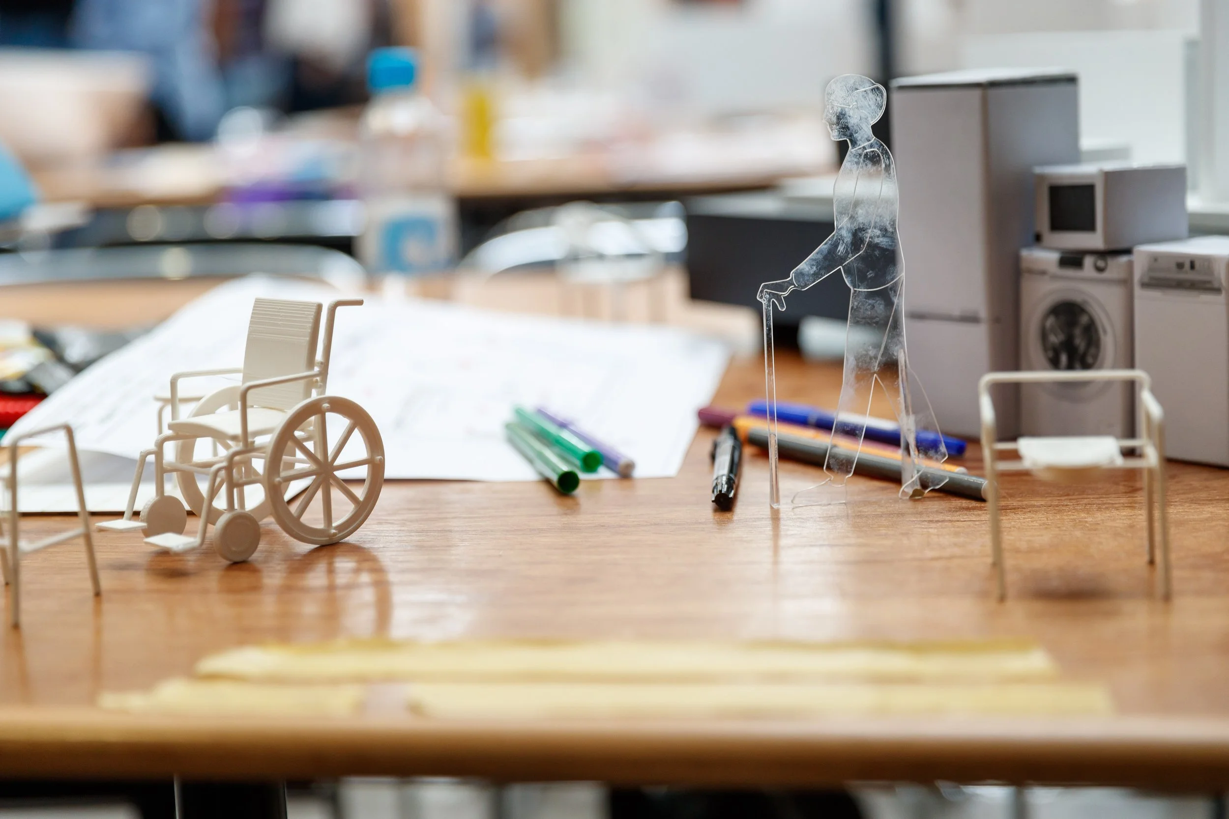 The second part, driven by "Originate" and "Trial" processes, began the exciting process of turning these ideas into tangible designs. Using masking tape and chalk, we mapped out a simulated flat in an actual 1:1 scale, representing positions of walls, door swing angles, and placements of fixtures like beds and toilets that could potentially hinder movement or pose safety hazards. Experts from HKHS, the Occupational Therapist Association, Project Hap Sap, and Design Matter Ltd lent their expertise on materials, colours, and textures, to help teams bring their visions to life through physical scale models and mood boards.